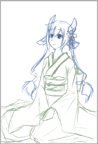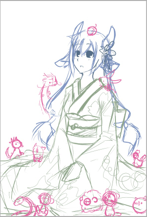 下書きのままだと地味ですが、着物には色塗りの段階で模様を入れようと思っています。